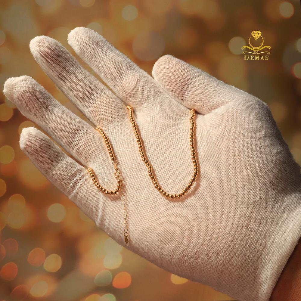 سلسال ذهب عيار 18 بتصميم كروي ناعم من Demas Gold، يتميز بخفة وزنه ولمعانه الجذاب الذي يضيف لمسة من الأنوثة والرقي لإطلالتك. خيار مثالي للهدايا أو للاستخدام اليومي الأنيق.