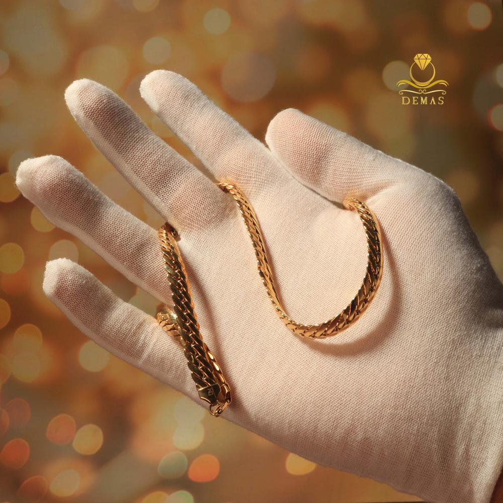 سلسال فاخر عيار 18 من Demas Gold، بتصميم أنيق يضفي لمسة مميزة على إطلالتك اليومية والمناسبات الخاصة. يتميز ببريقه الجذاب وجودته العالية التي تضمن لك قطعة تدوم طويلاً وتمنحك إحساس بالفخامة.